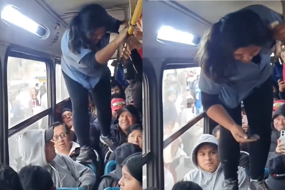 Sul bus in Perù una bigliettaia si arrampica sui sedili e sui passeggeri per riscuotere i biglietti. Il video diventa virale sui social