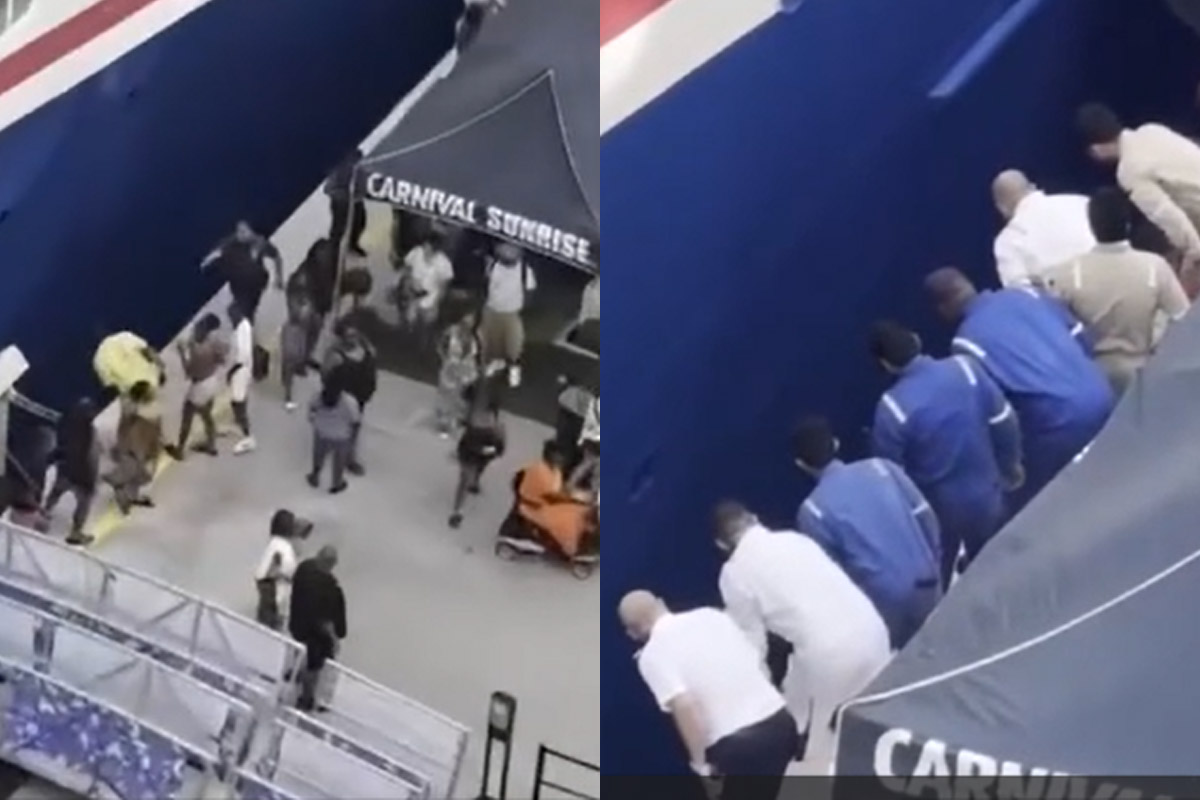 La madre non esita nemmeno un secondo: si sporge, poi si lancia in mare raggiungendo il figlio tra lo scafo e la banchina. Intanto alcuni membri dell’equipaggio, affacciati dal lato della Carnival Sunrise, gettano un salvagente e coordinano il recupero.