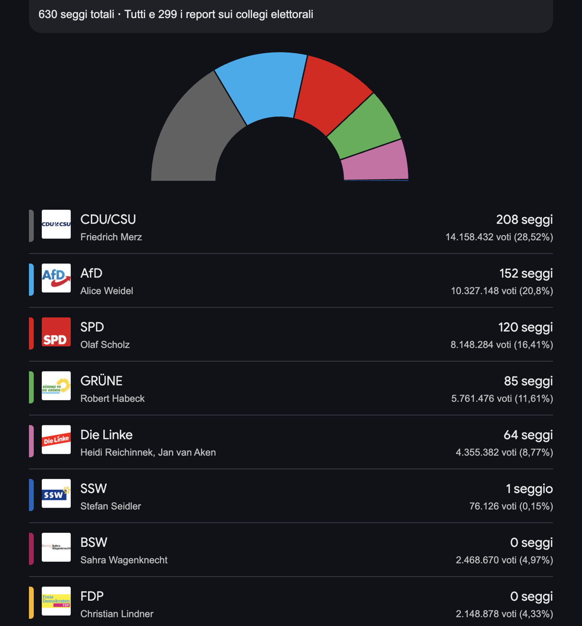 In Germania si sono svolte le elezioni politiche anticipate; un voto atteso nel paese ma anche in tutto il resto d'Europa dato il peso politico di una nazione nel pieno di una fase politica ed anche economica mai così difficile dato che si trova in piena recessione da mesi e mesi. Primo partito torna ad essere la CDU con il 28,5%, secondo, con un risultato clamoroso è l'AfD, estrema destra, che arriva al 20,8%, terzo partito è l'SpD che con il 16,4% ottengono il peggior dato della storia; poi i Verdi con l'11,6% e Die Linke con il 8,77%. Fuori gli altri partiti che non superano la soglia del 5%. Questi i risultati definitivi e la suddivisione dei seggi (630 seggi, maggioranza 316): CDU: 208 - AfD: 152 - SPD: 120 - Verdi: 85 - Linke: 64 - FDP: 0 - BSW: 0 - SSW: 1