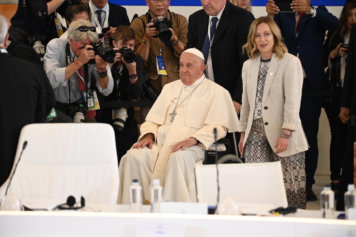 E ancora: “Grazie davvero ancora per aver accettato il nostro invito, grazie per la prima volta di un pontefice al G7, grazie per le sue parole che sono chiaramente fonte ispirazione per ciascuno noi”. Lo ha detto la premier Giorgia Meloni. “E grazie – ha continuato – per aver dato la sua disponibilità a rimanere per ascoltare gli interventi degli altri leader, perché sappiamo che è molto impegnativo”. Poi Meloni ha chiesto alla stampa di lasciare la sala, perché il resto della sessione è a porte chiuse.