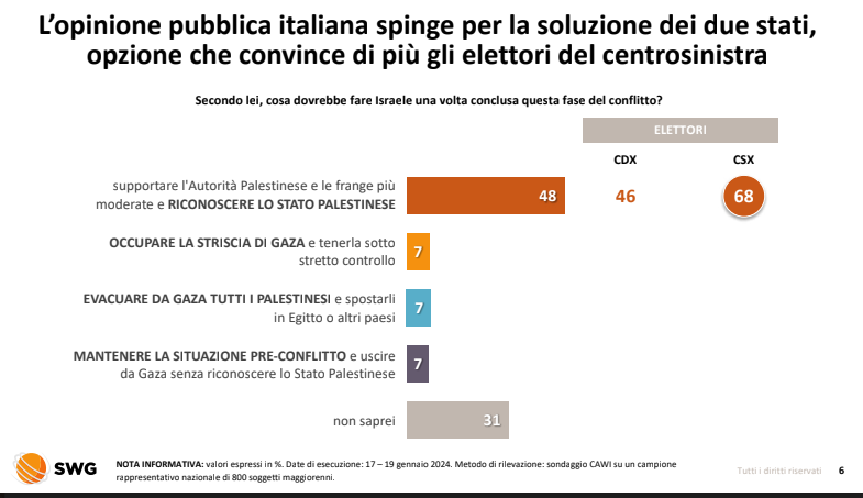 La prospettiva per il nodo israelo-palestinese appare invece chiara: la soluzione dei due stati risulta quella più auspicata e pochi condividono le opzioni ipotizzate da Netanyahu, come l’evacuazione totale dei palestinesi da Gaza o l’occupazione della Striscia da parte delle autorità israeliane.
