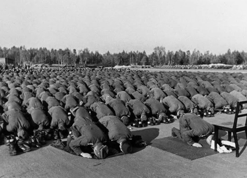 La foto qui sotto - un’immagine forse comprensibilmente rara - ritrae soldati della 13a Divisione “Handschar” delle Waffen-SS tedesche mentre pregano rivolti alla Mecca. Fu scattata a Neuhammer am Queis - oggi in territorio polacco - nel 1943 durante l’addestramento. La 13a era una divisione alpina, creata perlopiù reclutando soldati di etnia bosgnacca - bosniaci musulmani - nei territori jugoslavi già conquistati dalle forze tedesche.