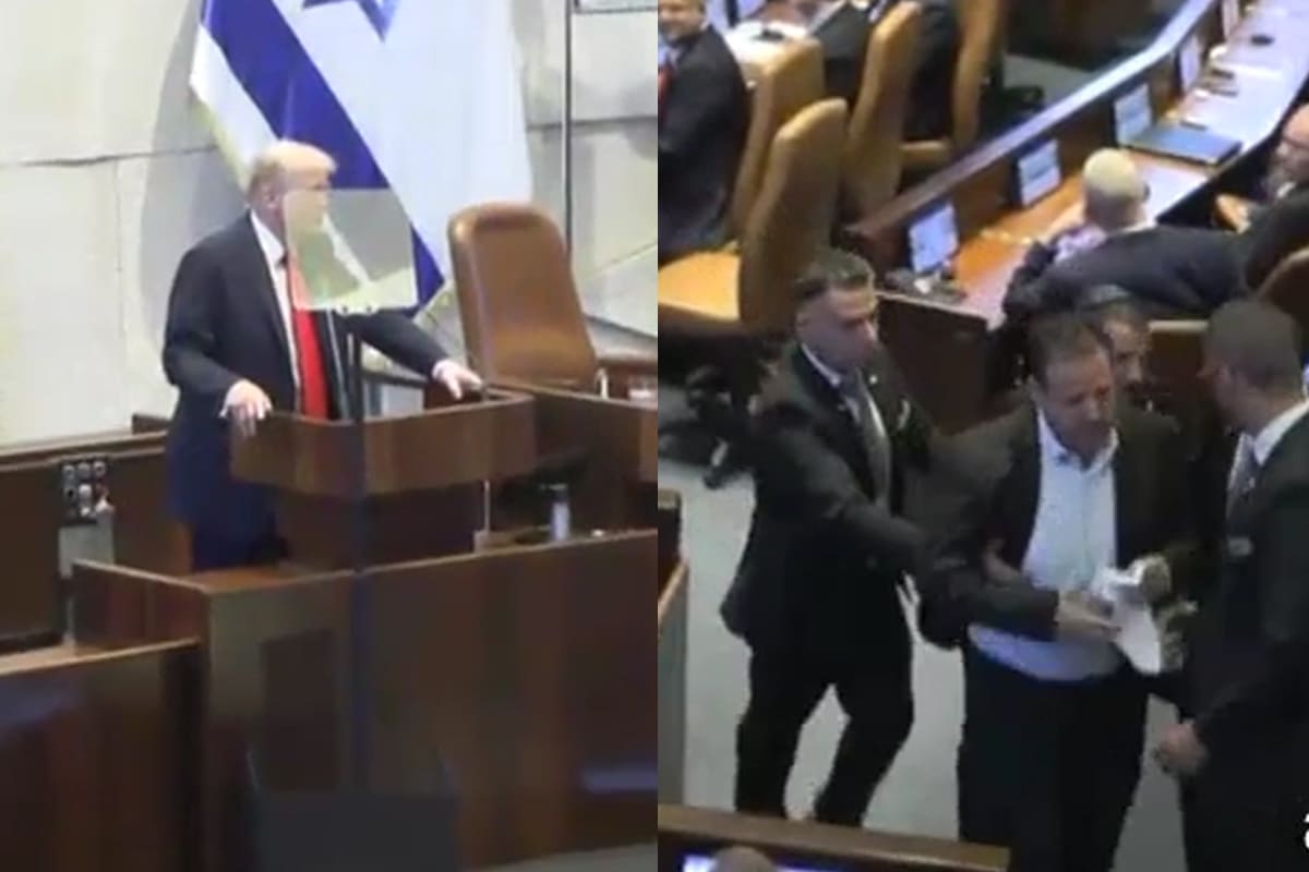 Il discorso di Donald Trump alla Knesset interrotto da due deputati del partito Hadash che mostrano cartelli “Riconoscere la Palestina”. Espulsi dall’aula, l’ex presidente Usa ironizza: “Servizio molto efficiente”.
