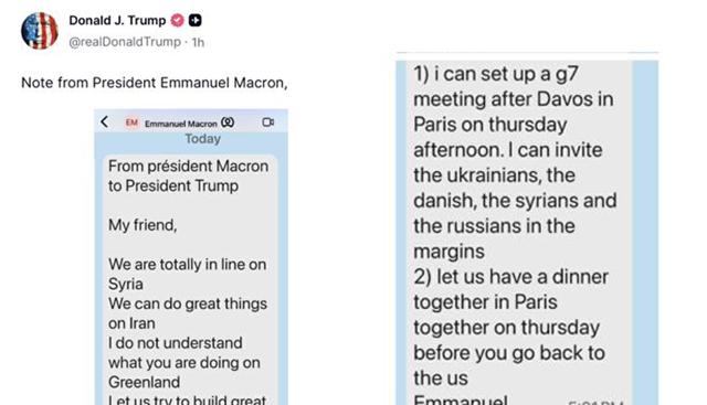 Il presidente americano Donald Trump ha condiviso sul suo Truth Social quello che sembrano essere alcuni screenshot di un messaggio ricevuto oggi dal capo dell'Eliseo Emmanuel Macron. ''Nota dal presidente Macron al presidente Trump. Caro amico, siamo perfettamente in linea rispetto alla Siria. Possiamo fare grandi cose sull'Iran. Non capisco quello che stai facendo sulla Groenlandia'', si legge nella nota che Macron avrebbe scritto a Trump.