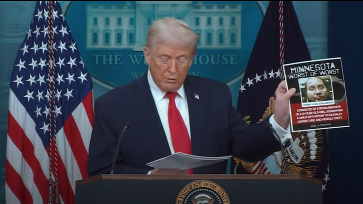 Donald Trump ha aperto una conferenza stampa alla Casa Bianca mostrando una dopo l’altra decine di foto segnaletiche di stranieri arrestati o ricercati in Minnesota, trasformando il briefing in un attacco frontale contro le politiche migratorie e le autorità locali democratiche.