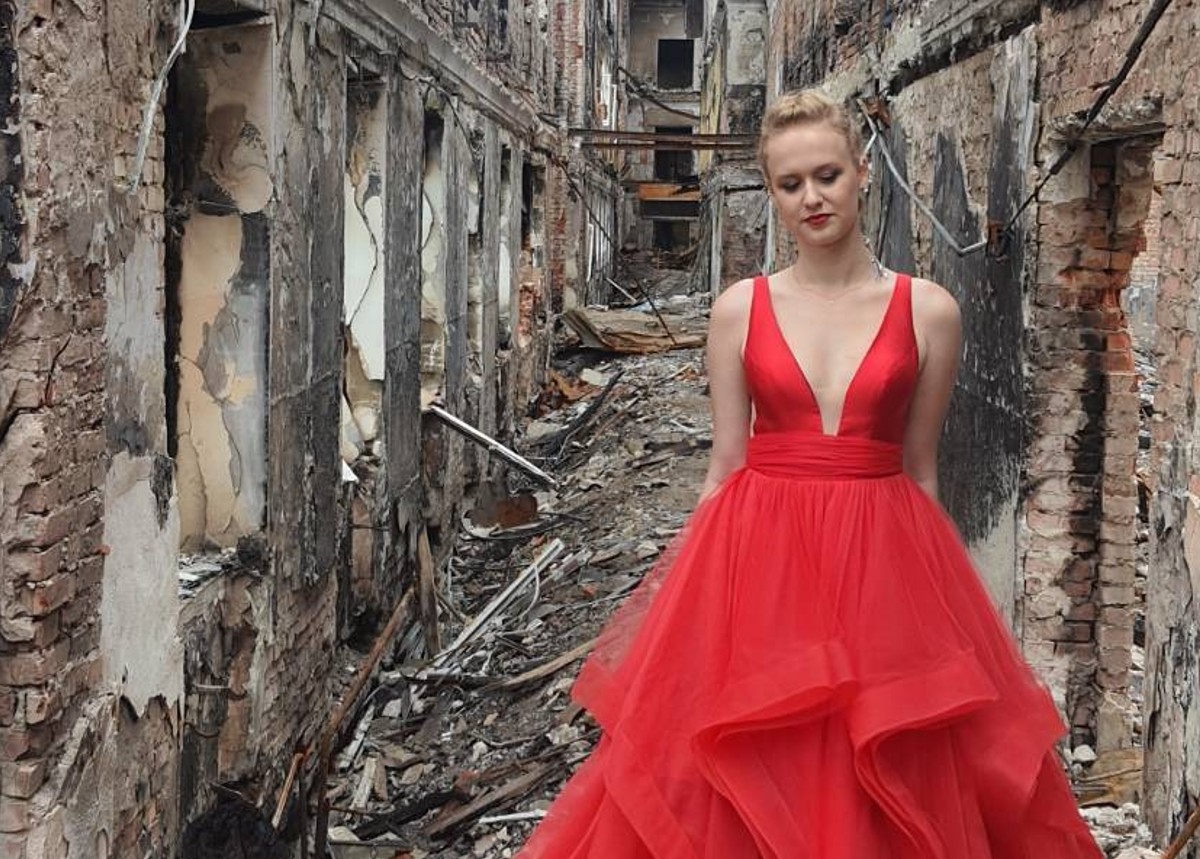 Ucraina, la foto di Valerie diventa virale: chi è la ragazza in abito rosso che posa sulle macerie della propria scuola