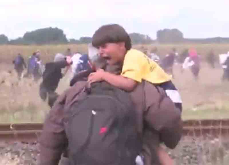 Le lacrime del bambino dopo che il padre gli cade addosso. Circolano in rete nuove immagini della fotoreporter ungherese Petra Laszlo, giornalista dell'emittente N1Tv, vicina al partito di estrema destra Jobbik e licenziata dopo che è stata vista filmare la corsa dei migranti e fare lo sgambetto a un uomo che porta in braccio un bambino e scalciare i migranti in fuga nel corso di uno dei tanti disordini avvenuti nel campo profughi di Roszke.