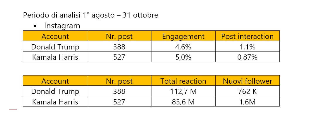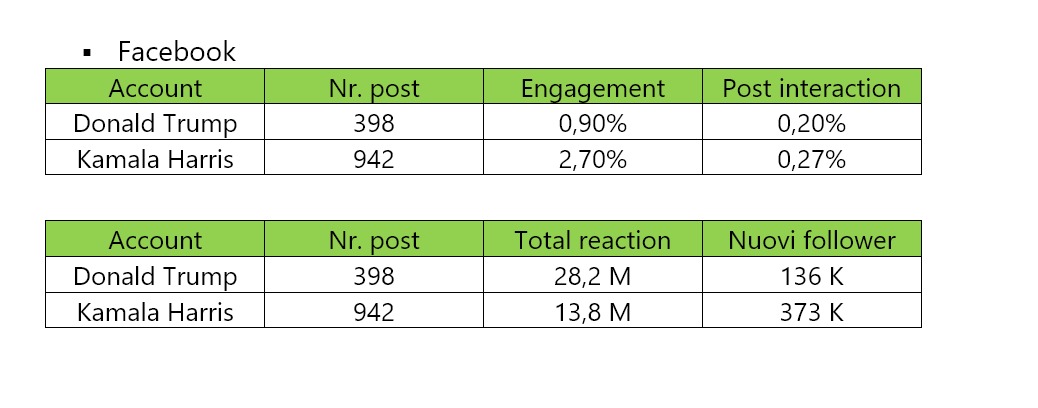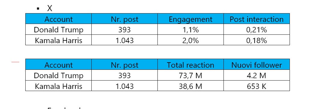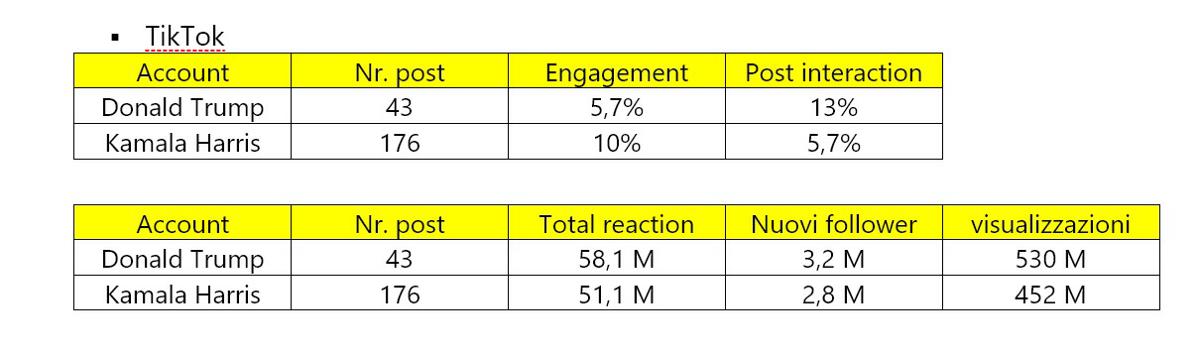 Su Instagram come dicevamo la superiorità della produzione è per la Harris ma gli altri parametri di analisi sono per lo più a favore di Trump. L’engagement è stato del 4,6% per il repubblicano e del 5% per la democratica. L’interazione invece è pro Trump (1,1% contro il 0,87% della Harris). Il totale delle reaction è stata di 112,7 mln per Trump e di 83,6 mln per Harris.