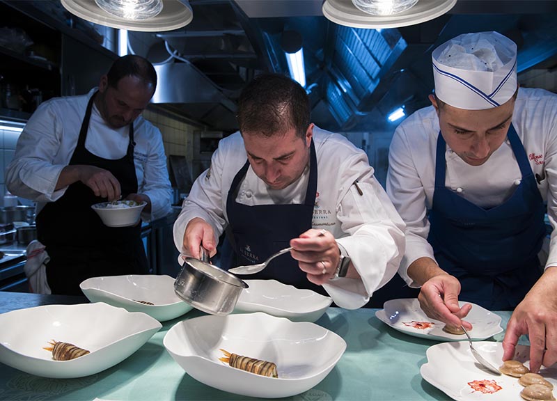 La bellezza della Costiera Amalfitana, i sapori della cucina Mediterranea. Torna per il terzo anno consecutivo la rassegna “Positano Gourmet – A cena con le stelle” che ospita chef di fama internazionale a “La Serra”, il ristorante stellato Michelin dell’hotel Le Agavi di Positano, guidato dal resident Luigi Tramontano (al centro nella foto). Quattro cene a quattro mani per celebrare la cucina Mediterranea, i suoi sapori, i suoi colori, il tutto accompagnato da un bicchiere di vino selezionato dalla sommelier Nicoletta Gargiulo. Questa edizione festeggia l’ingresso della struttura nel circuito Les Collectionneurs e verrà inaugurata domani da Umberto De Martino del Florian Maison di Bergamo, per poi proseguire con i francesi Theodor Falserdell’Engel Spa & Resort in Trentino (il 7 luglio) e Romain Barthe dell’Auberge de Clochemerle di Lione (13 settembre), e concludersi il 10 ottobre con Angelo Carannante del Caracol a Bacoli. Nella perla della Costiera non poteva mancare un menù d’eccezione. Al primo appuntamento spicca la rivisitazione degli spaghetti con le vongole dove viene utilizzata una pasta a forma di riso, cotta con l’acqua delle vongole, prezzemolo e aglio nero fermentato del Vietnam con note di liquirizia, clorofilla e pane croccante al peperoncino. E per dessert il fiore di ciliegio, un fiore passato nell’azoto liquido, con una mousse abbattuta, poi glassato al cioccolato bianco con uno gelato al zenzero, e arricchito da un crumble alla cannella e un gel di thè verde.
