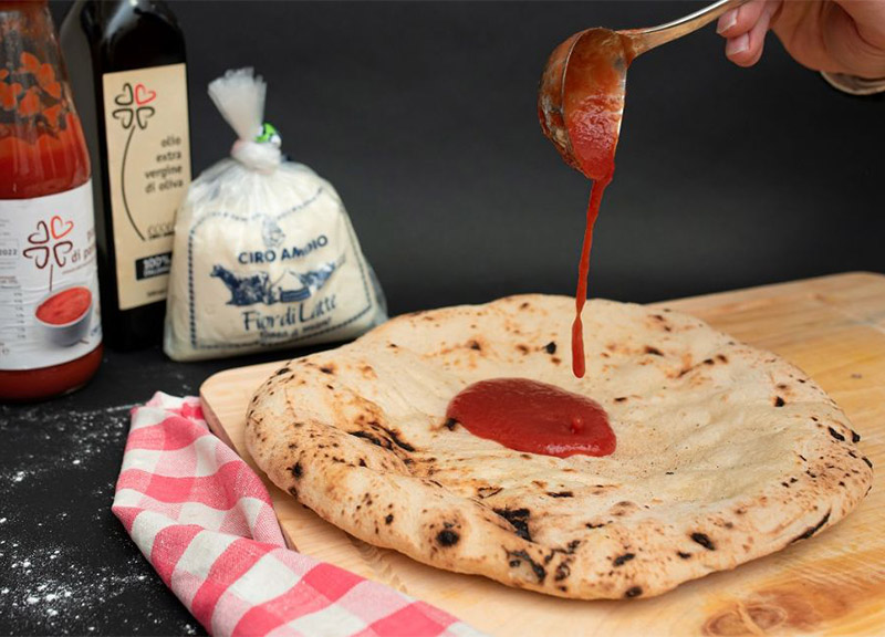 L’impasto è realizzato artigianalmente con farine macinate a pietra, acqua e lievito madre dagli artigiani di Ciro Amodio. Il disco, steso a mano e precotto, viene proposto in busta nel banco frigo delle botteghe Amodio pronto per essere condito a casa con gli ingredienti che si preferiscono. Una volta completato il topping si inforna nel forno di casa a 200/250 gradi centigradi per 10/15 minuti.