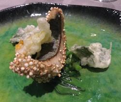 Già l'amouse bouche con tre piccole creazioni, denota la tecnica e la fantasia, in particolare il morbido grissino ripieno di crema di piselli.