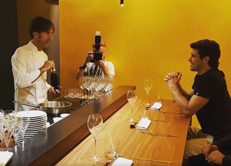 Mi ha fatto grande piacere cucinare per il grande Roberto Bolle star mondiale della danza e interprete della cultura italiana. Seduto nello spazio cucina ha apprezzato il trancio di Ombrina e pane abbrustolito con scarola, pinoli e uvetta. Poi, in compagnia del team Armani, Roberto ha gustato "Mango, ananas e polvere di origano".