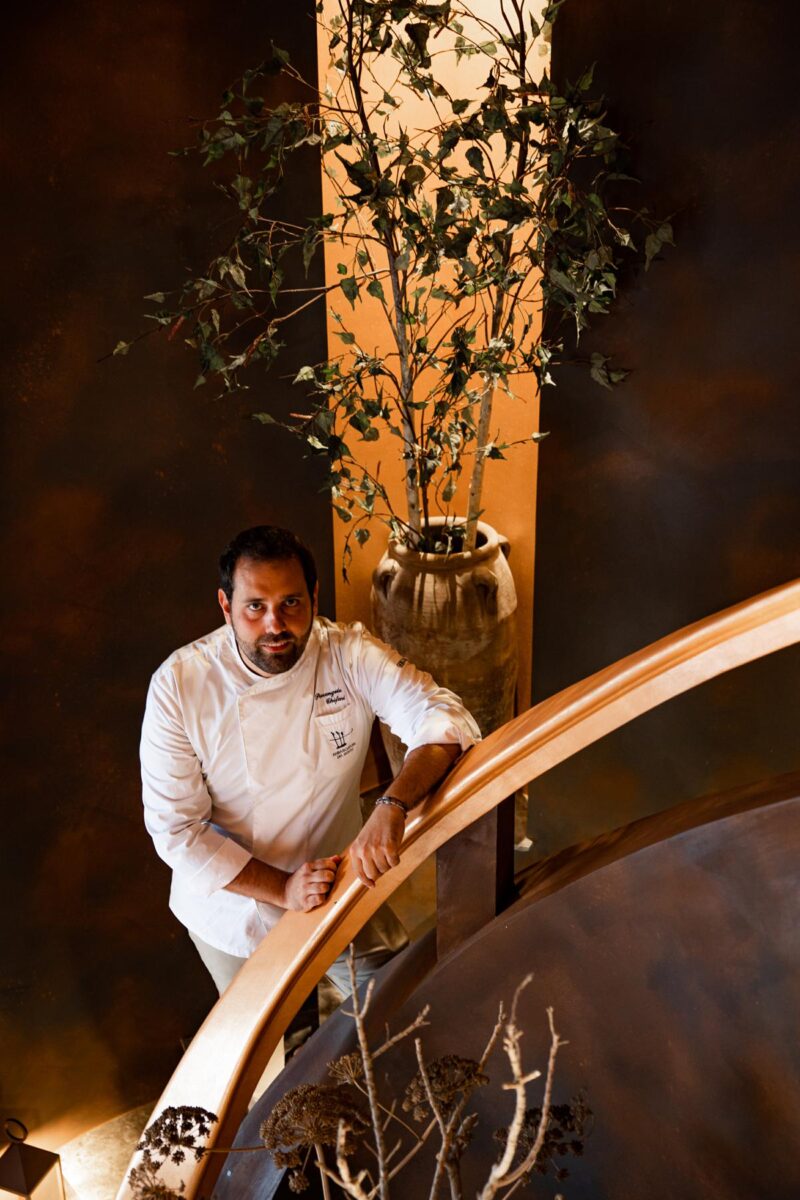 Segue il Gattano di Chifari, con tenerumi freschi saltati in padella, tuma di Castelvetrano, crema di pomodoro corbarino, mollica di pane fresco, neve di caciocavallo Ragusano Dop e olio all’aglio rosso di Nubia. In abbinamento un Etna Rosso DOC di Neri dalle note di frutta matura e spezie dolci.