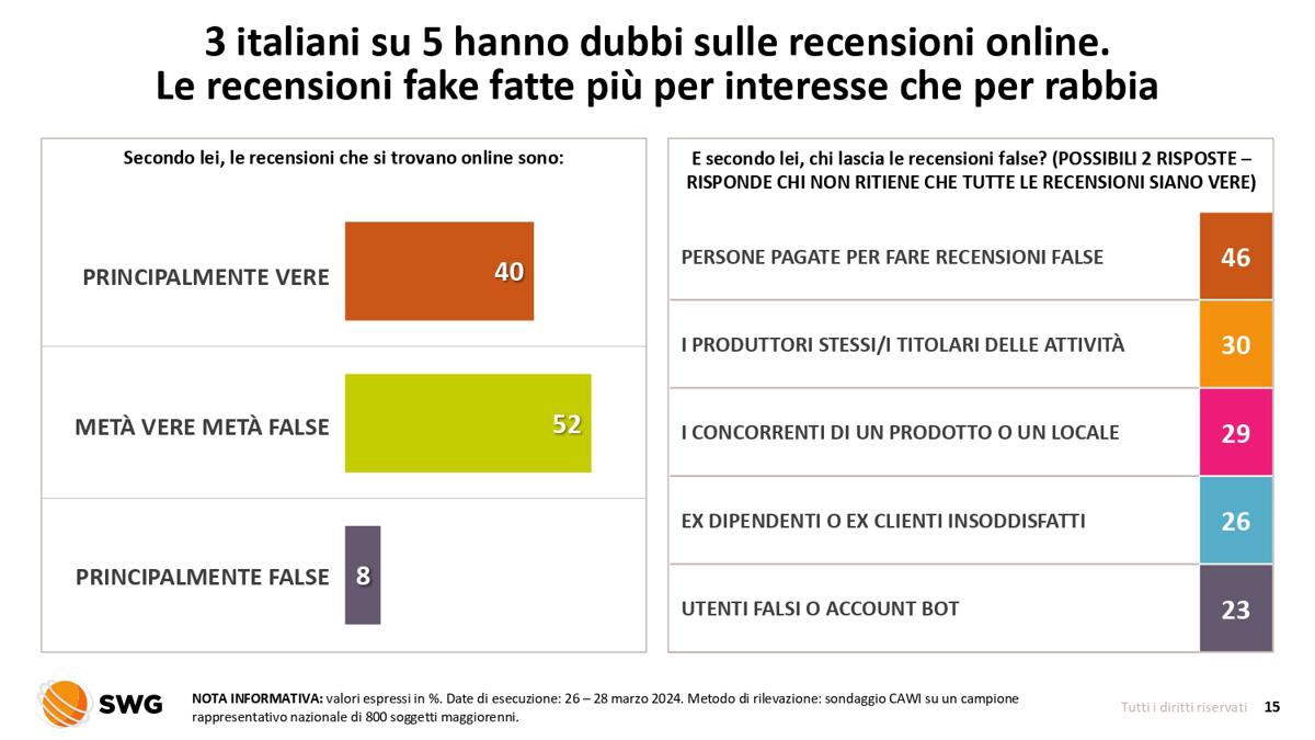 Tuttavia, la diffidenza sulla veridicità delle recensioni è piuttosto diffusa: sono solo 2 intervistati ogni 5 a reputarle generalmente vere, contro poco meno di 1 su 10 che le ritiene generalmente false. Ok leggere le recensioni, quindi, ma con attenzione per scovare quelle fake.