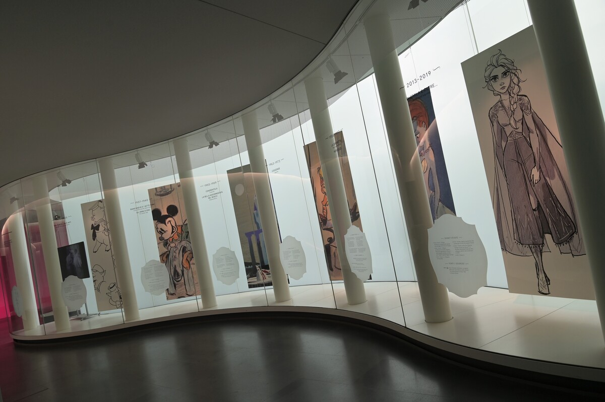 Queste sono anche le sezioni tematiche della mostra, in cui trovano collocazione le storie più famose da cui sono stati tratti i film Disney e vengono presentate in chiave narrativa attraverso l’esposizione dei bozzetti preparatori di ricerca creativa, incentrati sull’esplorazione di personaggi, ambientazioni e trame narrative.