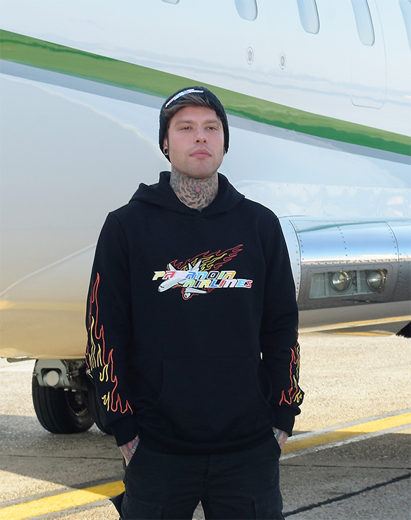 Aeroporto di LINATE Milano 22-01-2019. FEDEZ presenta il suo nuovo album musicale "PARANOIA AIRLINES". Fedez veste PARANOIA AIRLINES COLLECTION Design by TheFerragnez