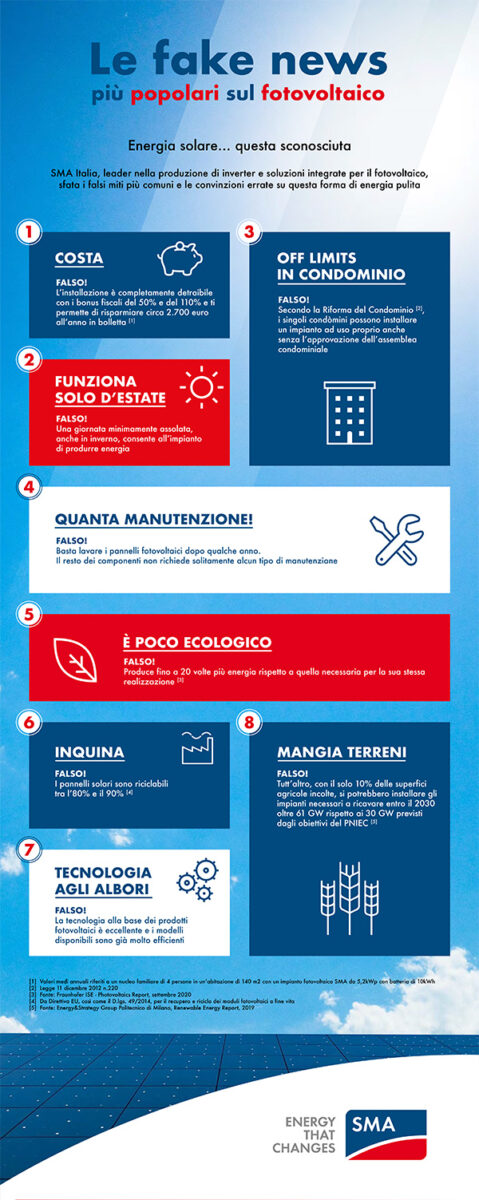 Spesso, a pesare attorno all’energia verde, non è solo la burocrazia, ma alcuni limiti di vedute: convinzioni errate e falsi miti. Ecco allora che SMA Italia, attraverso una guida dettagliata, cerca di smontare, punto per punto, le bufale sul solare.