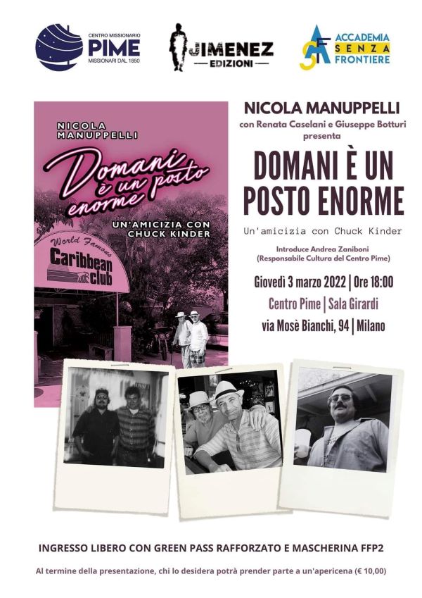 Domani è un posto enorme è il libro, pubblicato da Jimenez Edizioni, che racconta la vita di Kinder, gli aneddoti dietro le sue opere (da L’ultimo danzatore di montagna a Lune di miele, Silver Ghost e Snakehunter) e l’amicizia con “Nick” Manuppelli, che ne parlerà a Milano giovedì 3 marzo.