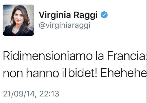 Nel 2014 Virginia Raggi era consigliera comunale in Campidoglio per il M5s e, ben lungi dal pensare di diventare un giorno sindaco di Roma, postava un tweet sul suo account personale, in cui prendeva in giro i francesi: "Ridimensioniamo la Francia: Non hanno il bidet Eheheheheh...".