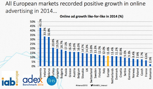 Sono i dati forniti da IAB Europe che, con l’AdEx Benchmark 2014 ha analizzato l’andamento di 27 mercati europei. Positivo in tutti i casi. Con crescita a doppia cifra in 20 Paesi. Al momento, afferma il report, è la pubblicità online a sostenere l’intero comparto: senza il web, il mercato europeo avrebbe registrato una flessione dell’1,6%.