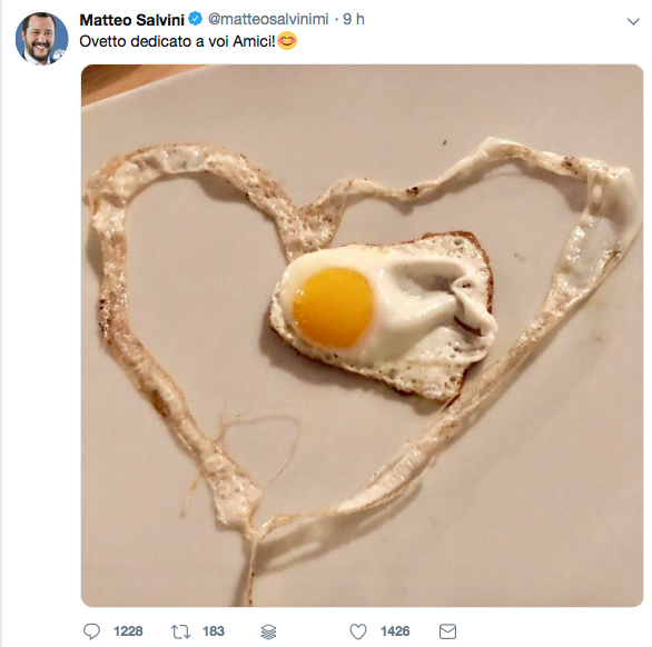 "Ovetto dedicato a voi amici" così intitolato il psot su Twitter del Ministro dell'Interno Matteo Salvini che si lascia andare alla cucina