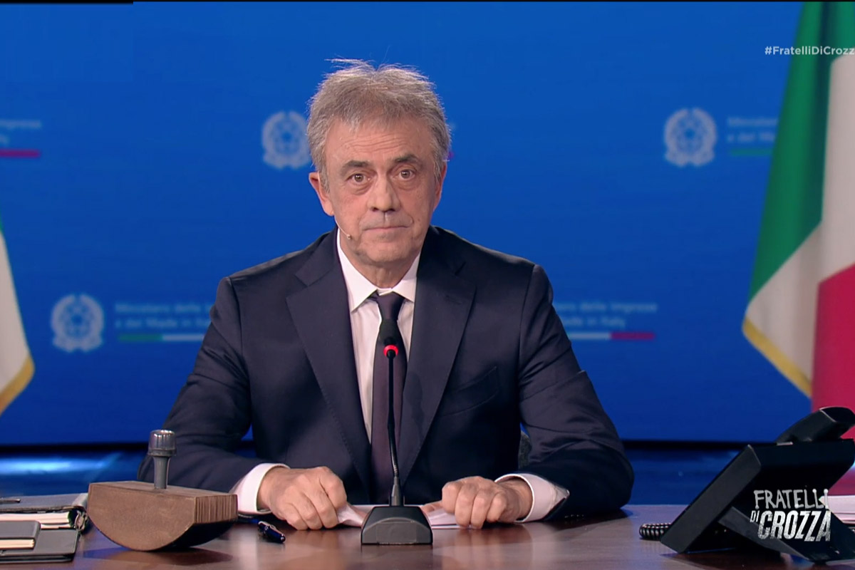 Maurizio Crozza torna a vestire i panni di Adolfo Urso nella nuova puntata di Fratelli di Crozza: tra fondi “sgocciolanti” del PNRR, multe europee cancellate e trionfi elettorali, la satira è servita