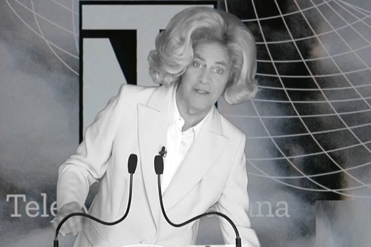 Un monologo che mescola politica e televisione, trasformando la kermesse del centrodestra in uno show in stile Rai1, tra scalette immaginarie, chiamate solenni dal palco e retroscena grotteschi. Al centro c’è Meloni che, come una vera conduttrice sanremese, svela uno dopo l’altro gli ospiti con tono enfatico e ritmo televisivo.