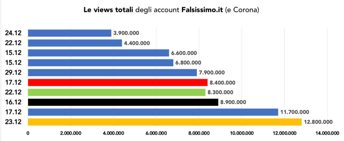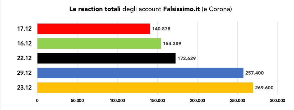 Il bilancio complessivo restituito dal monitoraggio è quindi chiaro. Dal lancio a oggi, tutti i post pubblicati sui tre account di Falsissimo.it e su quelli personali di Corona superano di poco i dieci milioni di reaction complessive, mentre la media delle visualizzazioni per puntata, anche nelle migliori performance, resta sensibilmente inferiore rispetto a quanto dichiarato.