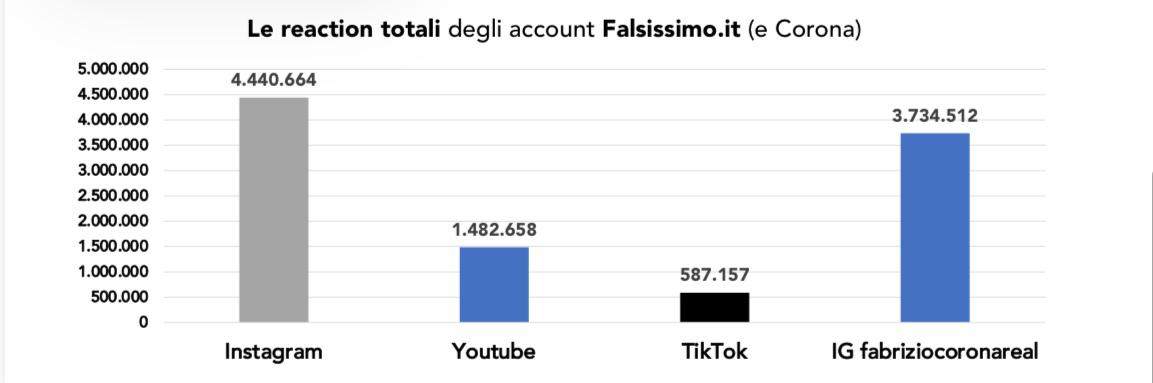 Anche estendendo l’analisi agli account personali di Corona su Instagram, TikTok e YouTube, il totale delle reaction raccolte nello stesso arco temporale arriva a 10.244.991. Un dato significativo, ma lontano dalla soglia dei 60–70 milioni indicata pubblicamente.