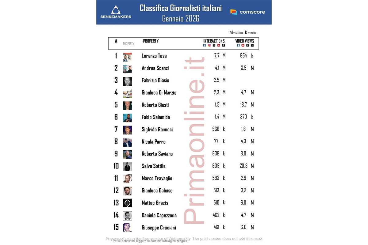 Dietro di lui sale Andrea Scanzi, secondo con 4,1 milioni di interazioni e 3,5 milioni di video views, performance sostenute – come segnala l’analisi – dal raddoppio dei contenuti pubblicati nel corso del mese. Terza posizione per Fabrizio Biasin con 2,5 milioni di interazioni.