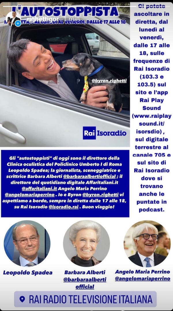 “L’autostoppista” è il primo programma radiofonico pet friendly dove il co-conducente è il bassotto pet influencer Byron con 26 mila follower su Instagram (@byron.righetti). Per questo suo format crossmediale innovativo multipiattaforma, Igor Righetti si è ispirato all’esilarante commedia "Il tassinaro" diretta e interpretata nel 1983 da suo cugino Alberto Sordi.