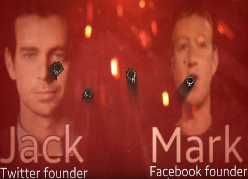 Due foto di Jack Dorsey, ceo di Twiter, e Mark Zuckerberg, ceo di Facebook, bucate da fori di proiettili. È l'immagine simbolo di un video propagantdistico dell'Isis in cui i due manager sono indicati come nuovi nemici del califfato.