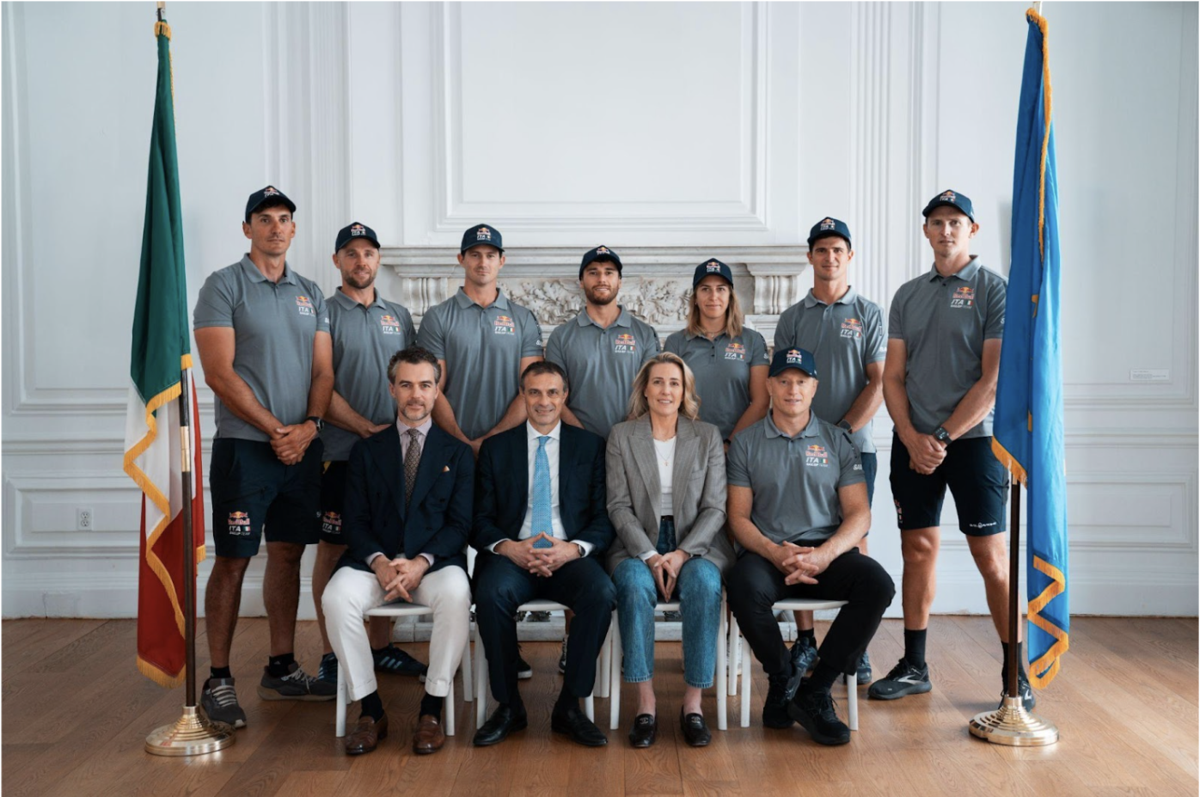 Il Team Red Bull Italy SailGP capitanato da Ruggero Tita (al centro) In basso da sinistra: Gian Luca Passi de Preposulo, il Console Fabrizio Di Michele, Assia Grazioli-Venier, Jimmy Spithill