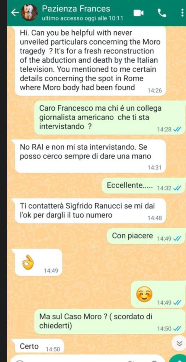 “Pazienza – ricostruisce Persichetti, che pubblica anche lo screenshot della conversazione – chiede a Ravarino se può aiutarlo ‘con particolari mai svelati riguardanti la tragedia di Moro’. Si tratta ‘di una nuova ricostruzione del rapimento e della morte da parte della televisione italiana. Mi hai accennato ad alcuni particolari riguardanti il luogo di Roma dove era stato ritrovato il corpo di Moro’.