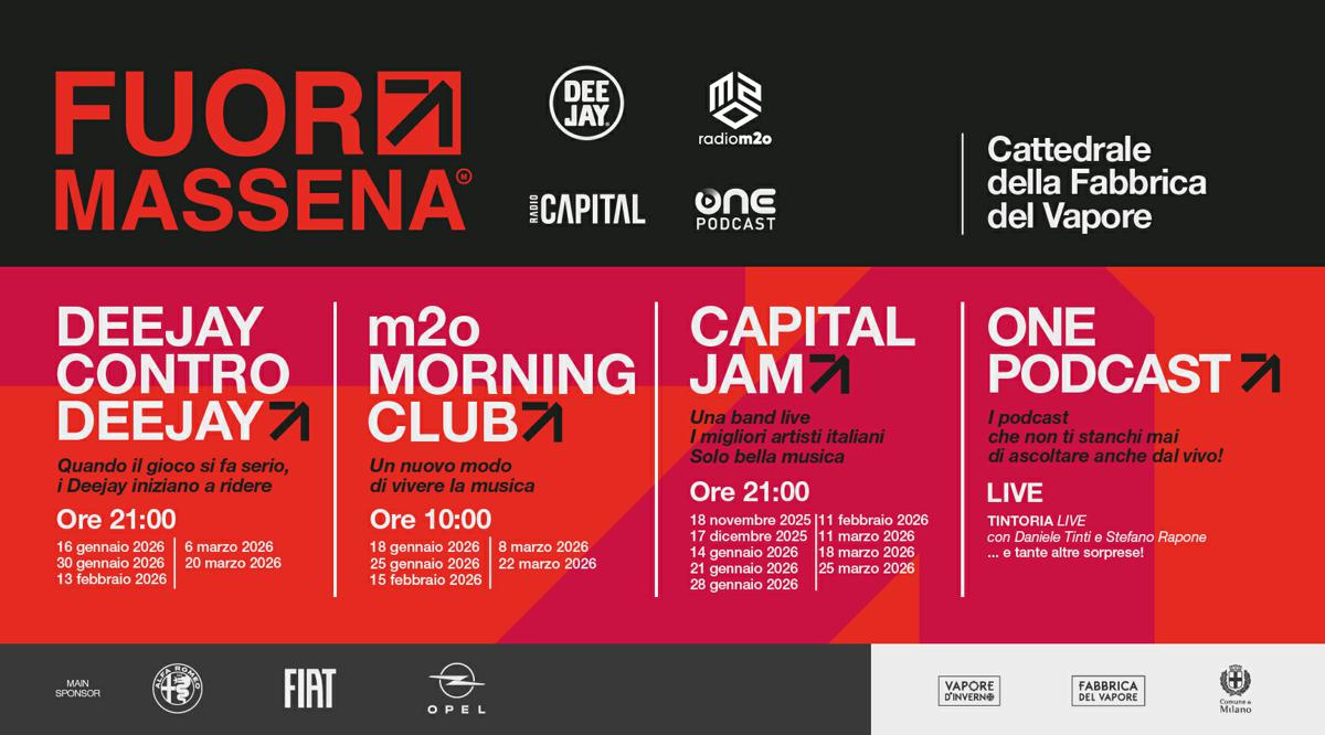 Da sempre compagna invisibile e presenza costante nella vita di milioni di persone, la radio porta sul territorio la sua capacità di racconto e di intrattenimento grazie a “Fuori Massena”, un progetto unico nel panorama radiofonico firmato Radio Deejay, Radio Capital, Radio m2o e OnePodcast. Colonna portante e punto di partenza di Capore d’inverno, il programma culturale invernale della Fabbrica del Vapore promosso dall’Assessorato alla Cultura del Comune di Milano, “Fuori Massena” presenta sul palco della Cattedrale della Fabbrica del Vapore un inedito cartellone di eventi, da novembre 2025 a marzo 2026. Uno spazio sperimentale, aperto a continue contaminazioni tra grande musica live, forme artistiche diverse, intrattenimento e interazione con il pubblico, in cui la radio trova una nuova “frequenza” per incontrare il suo pubblico dando forma e corpo alla propria anima sociale e aggregativa.