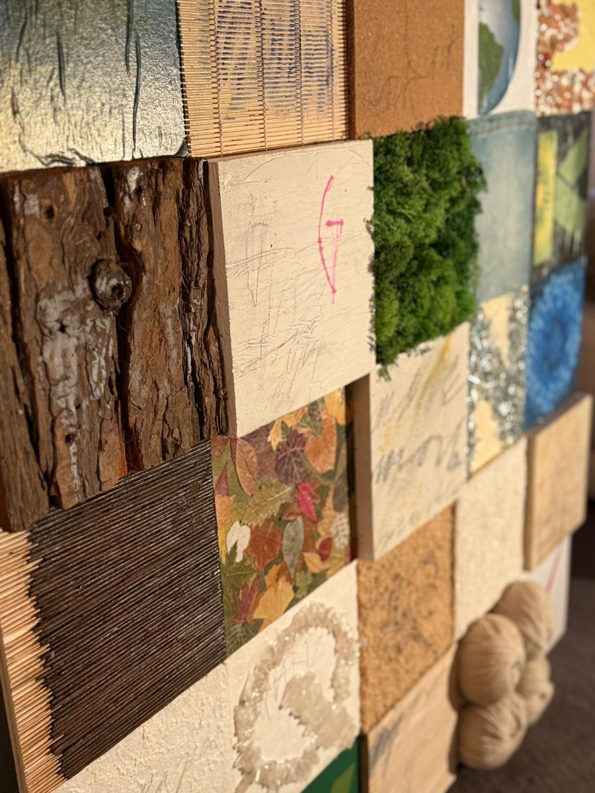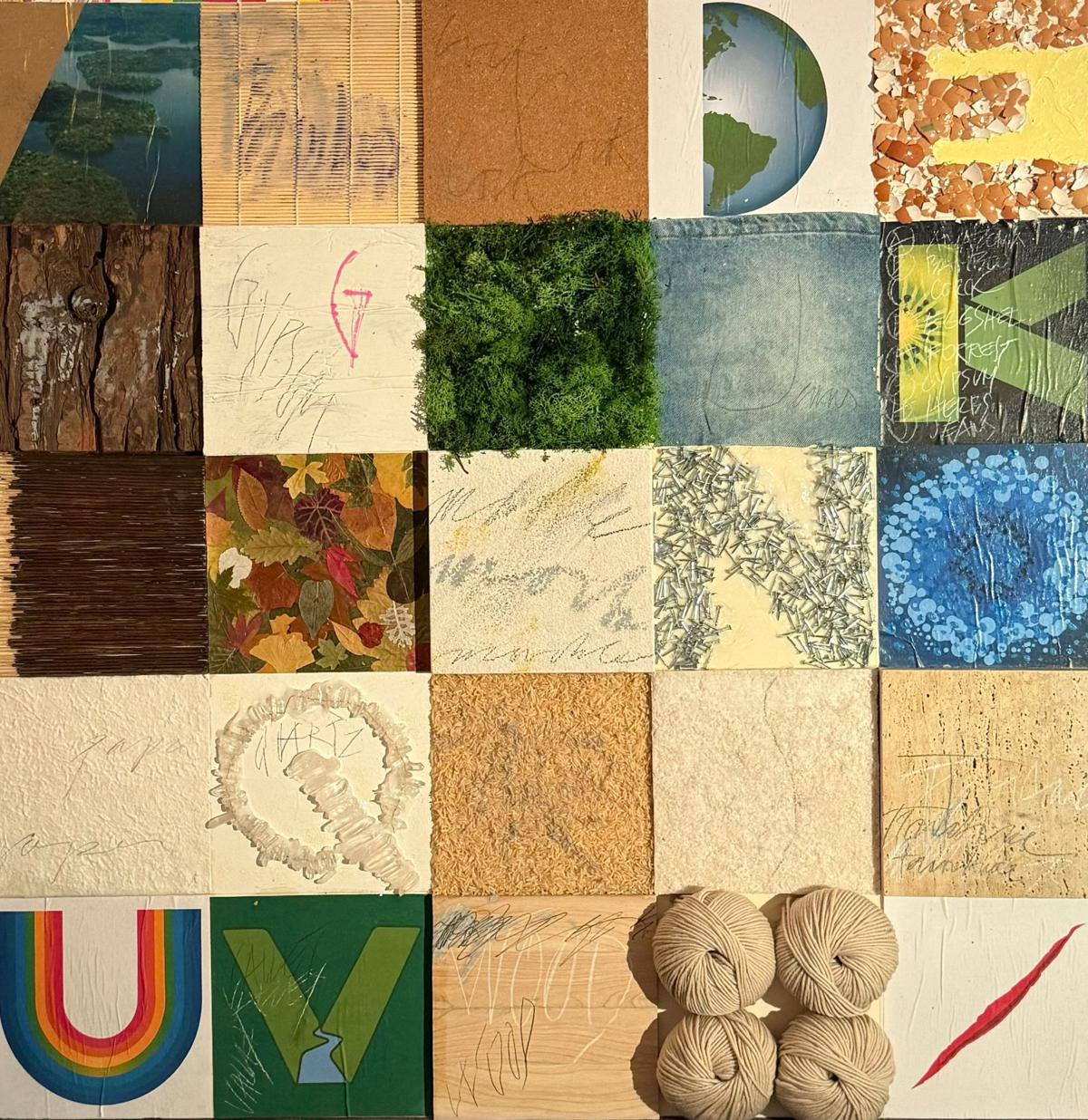 2.Sustainable Type, materiali riciclati e sostenibili su legno, 100x100 cm.