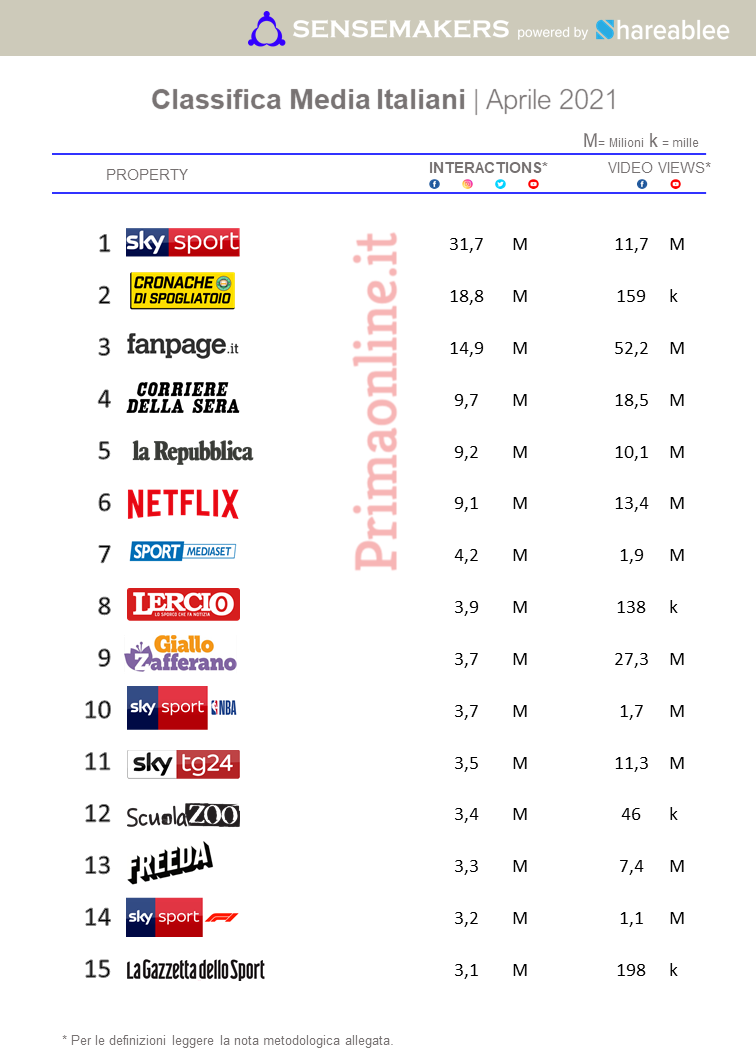 C'è movimento nella top 15 dei media italiani più social, la classifica di Sensemakers, basata sulle rilevazioni di Shareablee, pubblicata su Primaonline. In cima al podio c'è ancora SkySport, anche se in calo di interazioni (31,7 milioni) e video views (11,7 milioni), sui quattro social principali, Facebook, Youtube, Instagram, Twitter. La rete sportiva diretta da Federico Ferri è presente in classifica anche con SkySport NBA, il canale dedicato al campionato statunitense di basket, che passa dal settimo posto di marzo al decimo di aprile con 3,7 milioni di interazioni, e con SkySport F1 che passa dal nono al 14esimo posto con 3,2 milioni di interazioni.