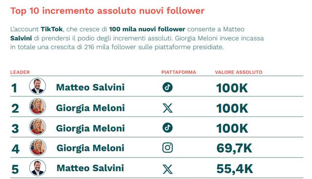Su questa piattaforma riesce a guadagnare molto anche il leader della Lega, Matteo Salvini che, passando ai valori assoluti, ottiene un incremento di ben 100 mila nuovi follower. Se ci soffermiamo invece sui defollowing, è possibile notare che i due leader che perdono iscritti su X sono Matteo Renzi e, per ragioni diverse in quanto sono mesi che si sono fermate le pubblicazioni, Elly Schlein. L’analisi periodica delle performance incassate dagli account social dei leader politici, è una bussola per misurare la capacità di catturare l’attenzione digitale dei follower e degli utenti. Una condizione sempre più necessaria per incidere sull’agenda del dibattito pubblico online.