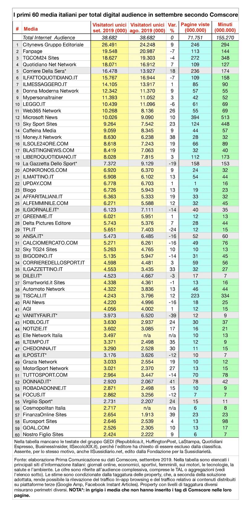 La classifica vede ai primi tre posti ancora una volta Citynews, Fanpage e TgCom24. Il gruppo editoriale di Luca Lani e Fernando Diana, con i suoi 50 giornali locali online, ha totalizzato 26 milioni e mezzo di visitatori unici, il 9% in più rispetto ad agosto. Il giornale online diretto da Francesco Piccinini si è fermato a 19 milioni e mezzo; il quotidiano digitale di Mediaset e i siti aggregati (Sportmediaset, Meteo.it, eccetera) si sono attestati a 18 milioni 600mila.