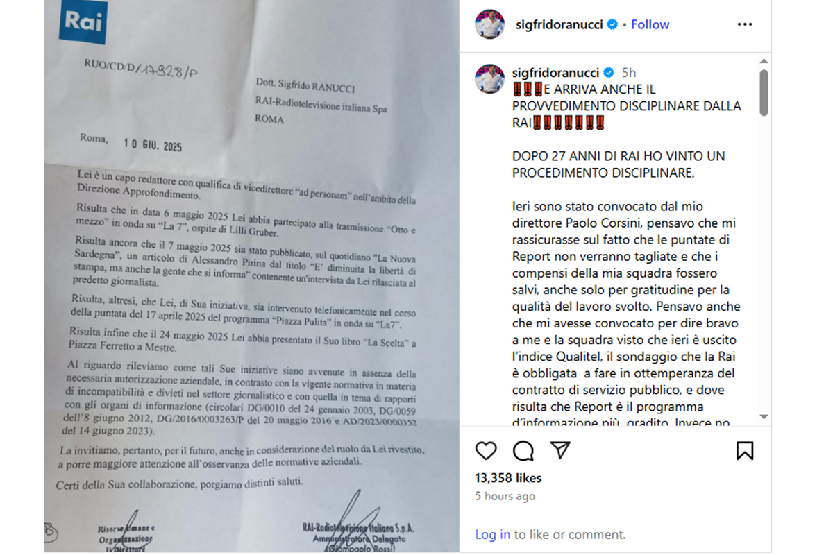 Il provvedimento disciplinare per il giornalista e conduttore di ‘Report’ è stato pubblicato dallo stesso Ranucci sul suo profilo Facebook dove ha postato la lettera datata 10 giugno firmata dall’amministratore delegato Rai, Giampaolo Rossi, e dal direttore delle Risorse Umane, Felice Ventura. “Dopo 27 anni di Rai ho vinto un procedimento disciplinare”, ha scritto il giornalista sui social. In particolare, nella lettera vengono contestate alcune dichiarazioni del giornalista rilasciate, secondo l’azienda, senza autorizzazione: “Mi accusano di aver partecipato alla trasmissione della Gruber il 6 maggio, senza essere stato autorizzato. Fatto non vero perché ero stato autorizzato dallo stesso Corsini telefonicamente per lanciare la seconda parte della stagione di Report”.