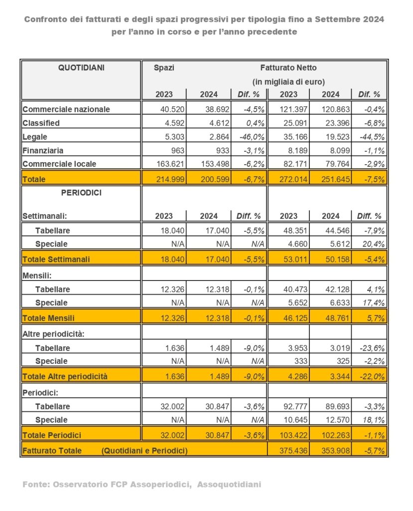 Giornali cartacei ancora in crisi sul fronte della raccolta pubblicitaria, secondo i dati dell’Osservatorio Stampa FCP relativi al periodo Gennaio-Settembre 2024 raffrontati con i corrispettivi 2023. Il fatturato pubblicitario del mezzo stampa in generale registra un decremento del -5,7%.
