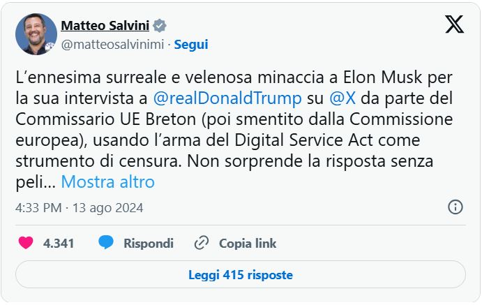 Il vice premier italiano, Matteo Salvini, ha difeso il numero uno di Tesla, Elon Musk, e l’altro a stretto giro ringrazia. “L’ennesima surreale e velenosa minaccia a Elon Musk per la sua intervista a Donald Trump su X da parte del Commissario Ue Breton (poi smentito dalla Commissione europea), usando l’arma del Digital Service Act come strumento di censura. Non sorprende la risposta senza peli sulla lingua di Musk.