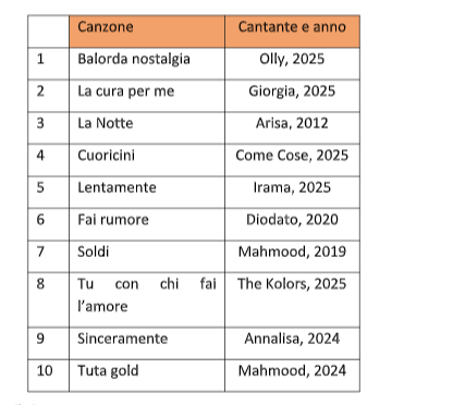 Settimo posto, ancora una volta per Giorgia e La cura per me (arrivò sesta lo scorso anno al Festival), ottavo per La terra dei cachi di Elio e le Storie Tese (furono secondi nel 1996), nono per Loretta Goggi e la sua Maledetta primavera (seconda nel 1981 alle spalle di Alice e Per Elisa) e decimo per Arisa e La Notte che precede di un soffio Lucio Corsi, undicesimo, con Volevo essere un duro (seconda al Festival 2025 e quinta all’Eurovision dello stesso anno).