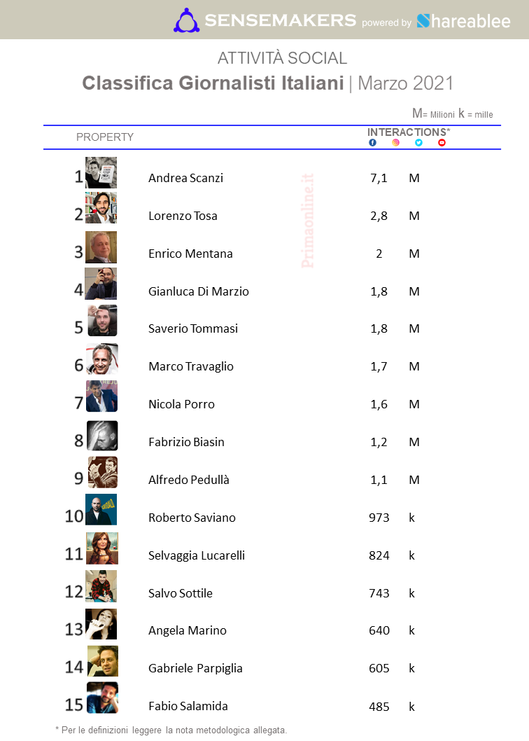 Nella Top 15 dei giornalisti più attivi sui social, realizzata da Sensemakers per Primaonline sulla base delle rilevazioni di Shareablee, anche Travaglio, slittato dal 3° al 6° posto con 1,7 mln di interazioni e Tommasi passato dal quarto gradino del mese di febbraio al quinto, con 1,8 mln di interazioni. Porro in discesa già a febbraio con la quinta posizione, scala di due posizioni raggiungendo il settimo posto della classifica, con 1,6 mln di interazioni.