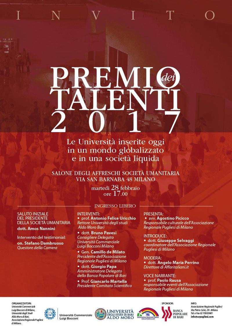 Porterà i saluti istituzionali Cristina Tajani, assessore alle Politiche del lavoro, Attività produttive e Risorse umane del Comune di Milano. La consegna del Premio sarà introdotta dal convegno “Le Università inserite oggi in un mondo globalizzato e in una società liquida”. Dopo i saluti introduttivi del dott. Amos Nannini, presidente della Società Umanitaria, ci sarà la tavola rotonda con l’introduzione dell’avv. Agostino Picicco e del dott. Giuseppe Selvaggi, rispettivamente responsabile culturale e coordinatore dell’Associazione regionale pugliesi di Milano. Moderati da Angelo Maria Perrino, direttore di Affaritaliani.it, interverranno il prof. Antonio Felice Uricchio, rettore dell’Università degli Studi di Bari, il dott. Bruno Pavesi, consigliere delegato dell’Università Luigi Bocconi, il gen. Camillo de Milato, presidente dell’Associazione regionale pugliesi di Milano, il dott. Giorgio Papa, amministratore delegato della Banca Popolare di Bari e il prof. Giancarlo Martella, docente dell’Università degli Studi di Milano e presidente del Comitato scientifico che ha scelto i premiati dopo aver analizzato i curricula dei circa duecento giovani che hanno inviato la propria candidatura. «Il Premio Talenti 2017», afferma l’on. Stefano Dambruoso, «offre una rara opportunità per affermare l’importanza del riconoscimento del merito. In un mondo globalizzato, veloce e disattento è essenziale incentivare la valorizzazione delle eccellenze, puntando anche sulla specificità delle nostre tradizioni formative. Favorire la circolazione di talenti è quindi un modo per impedire ogni omologazione culturale e contrastare il fenomeno della fuga di cervelli all’estero che sta minando progressivamente le nostre capacità di progresso futuro». «Il passaggio da una società solida a una liquida è avvenuto grazie a persone talentuose», dichiara il dott. Giorgio Papa, «per noi della Banca Popolare di Bari è un privilegio poter sostenere nuovi talenti che possano progettare un futuro migliore». «È un grandissimo onore per la nostra Associazione guidare questa sinergia tra l'Università di Bari e l'Università Bocconi di Milano per premiare giovani talenti e affermati professionisti che con la loro brillante carriera hanno dato lustro alle terre di Puglia riuscendo a competere nel mondo globale», afferma il gen. Camillo de Milato, «all'onore, però, si accompagna la responsabilità di proseguire in questa alleanza virtuosa anche nei prossimi anni perché chi ha messo a frutto i propri talenti riceva il giusto riconoscimento».