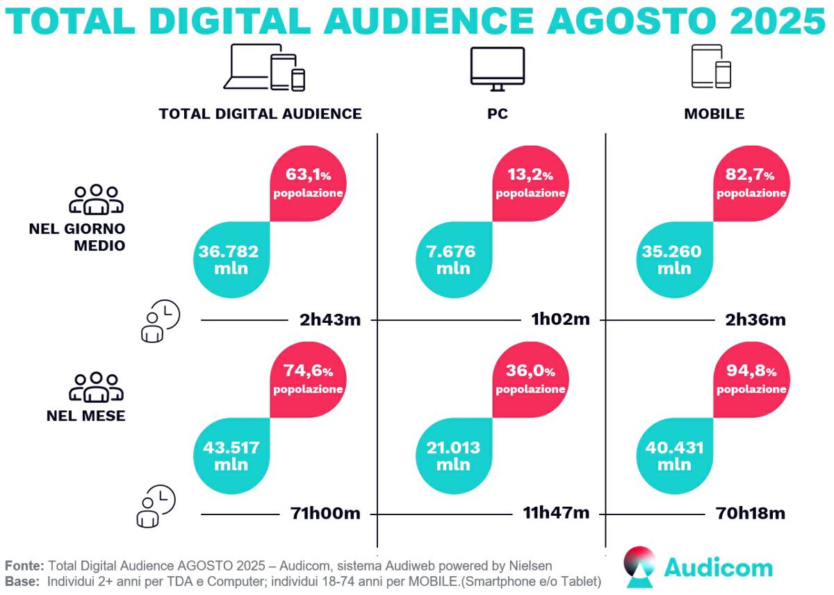 Nel giorno medio la Total Digital Audience in questo mese di rilevazione è rappresentata da 36,8 milioni di utenti che hanno navigato almeno una volta dai device rilevati (Mobile e Computer) per 2 ore e 43 minuti in media per persona.