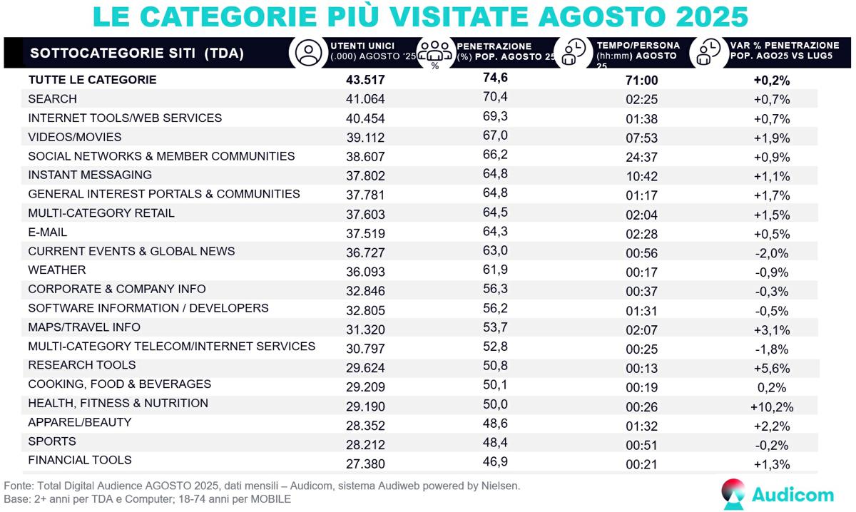 È il caso delle piattaforme video (Videos/Movies con un +1,9% rispetto a luglio, pari a 39,1 milioni di utenti mensili), dei social network che, pur mantenendo un’audience stabile, vedono crescere il tempo dedicato alla fruizione (+4,5%), della messaggistica istantanea (+1,1% degli utenti), i portali generalisti (+1,7%), del retail (+1,5%), mappe e viaggi (+3,1% gli utenti mensili e +12,6% il tempo), salute, benessere e nutrizione (+10,2%).
