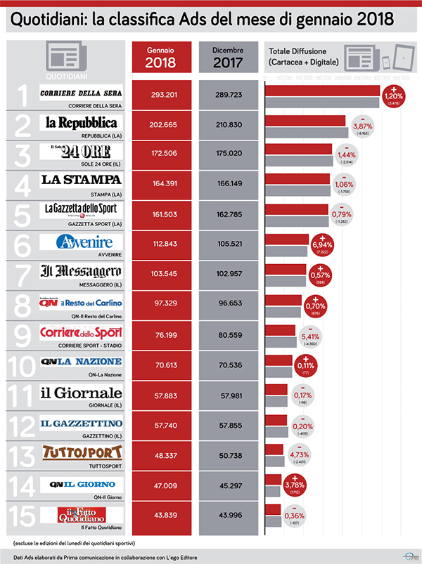 Ads: la diffusione cartacea e digitale a gennaio 2018 per quotidiani e settimanali e a dicembre 2017 per i mensili
