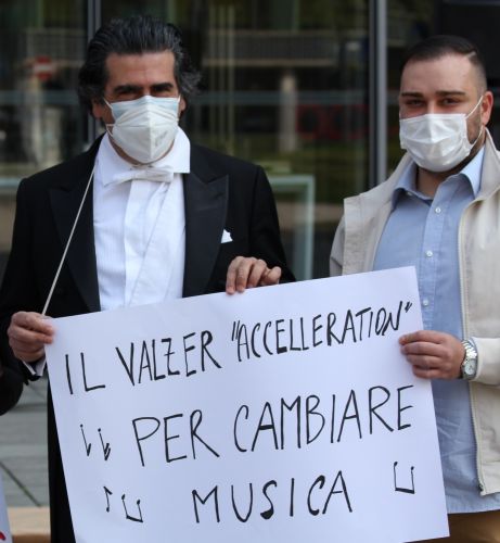 Le note del ‘Valzer dell’accelerazione’ di Strauss, eseguite da alcuni musicisti diretti dal maestro Alberto Veronesi davanti a Palazzo Lombardia, per chiedere alla Regione “un cambio di passo” nella campagna vaccinale. L’iniziativa si è svota questa mattina ed è stata promossa dallo stesso Veronesi, già candidato alle scorse elezioni a Milano con la lista a sostegno di Sala e ora impegnato con il progetto civico “Lavoriamo per Milano con Sala” in vista delle prossime elezioni.