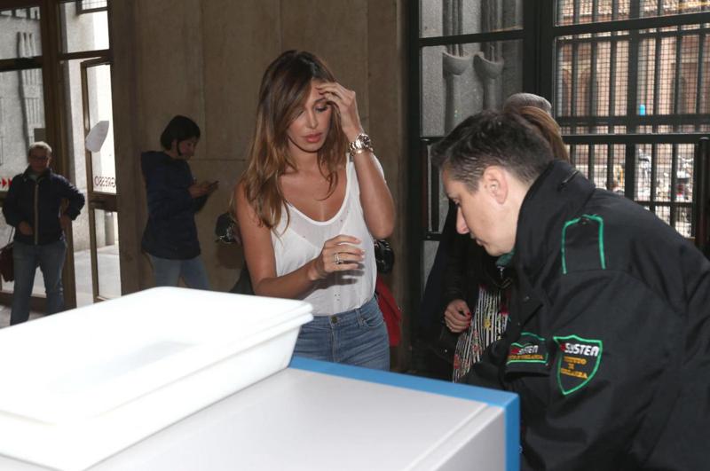 Belen Rodriguez arrivata in Tribunale per il processo Corona. Super tacchi e folla di fan
